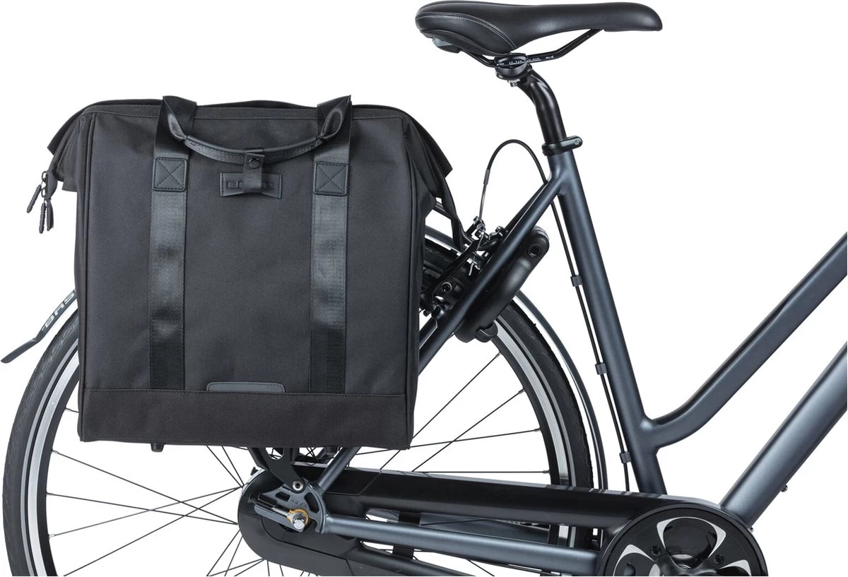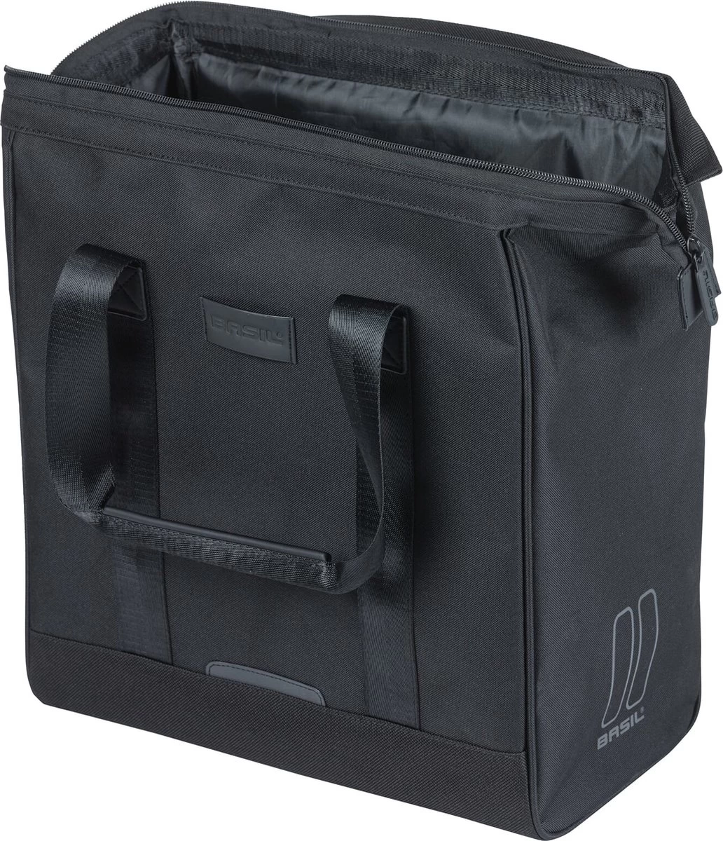Met de Basil Grand fietsshopper wordt boodschappen of andere inkopen doen een feestje. Hij ziet er namelijk stijlvol en luxe uit, mede dankzij de zwarte kleur. Bovendien is hij gemaakt van waterafstotend 600D polyester en beschikt de shopper over een groot hoofdvak inclusief een gepolsterd (laptop)vak. Handig voor je studie aan de universiteit of voor je kantoorwerk. Met 23 liter inhoud kan je er dan ook de nodige boodschappen of andere spullen in kwijt. De tas is vormvast en dankzij de grootte kun je er met gemak pakken drinken staand in kwijt.