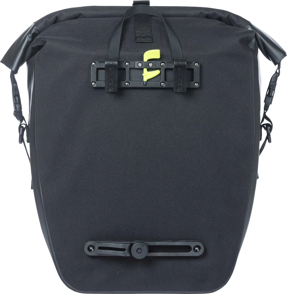 De tas sluit je met een roltopsluiting af. Deze sluiting kun je op twee manieren rollen: naar de achterzijde van de tas of bovenop de tas. De kliksluitingen kun je namelijk flexibel inzetten. Net wat je zelf fijner vindt! Je bevestigt de fietstas met het Basil Hook On systeem aan de fiets. Je kunt de tas extra bevestigen aan de frame van de fiets dankzij het extra instelbare haakje aan de onderzijde van de tas.