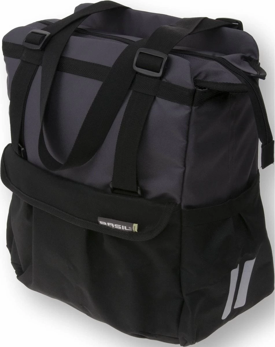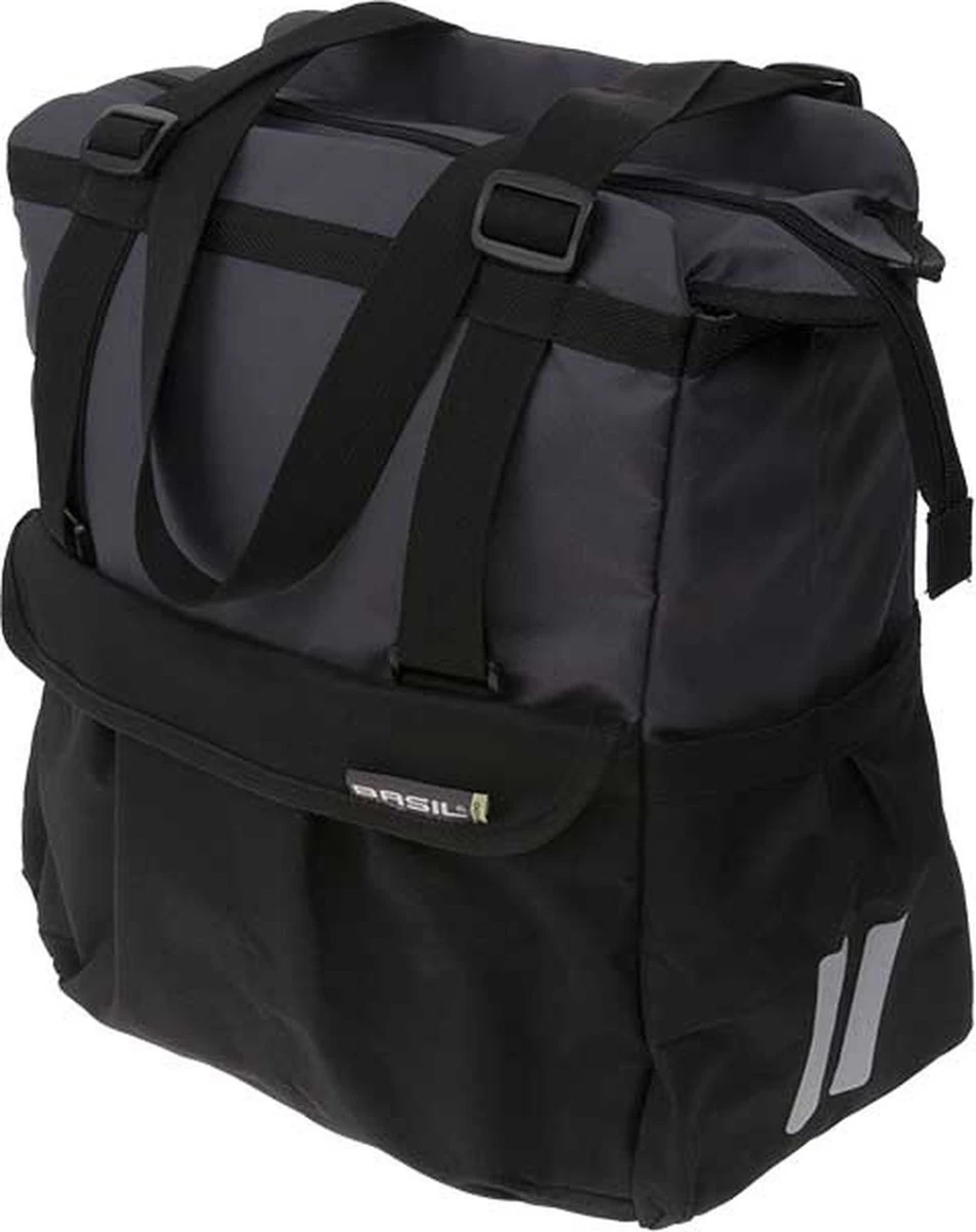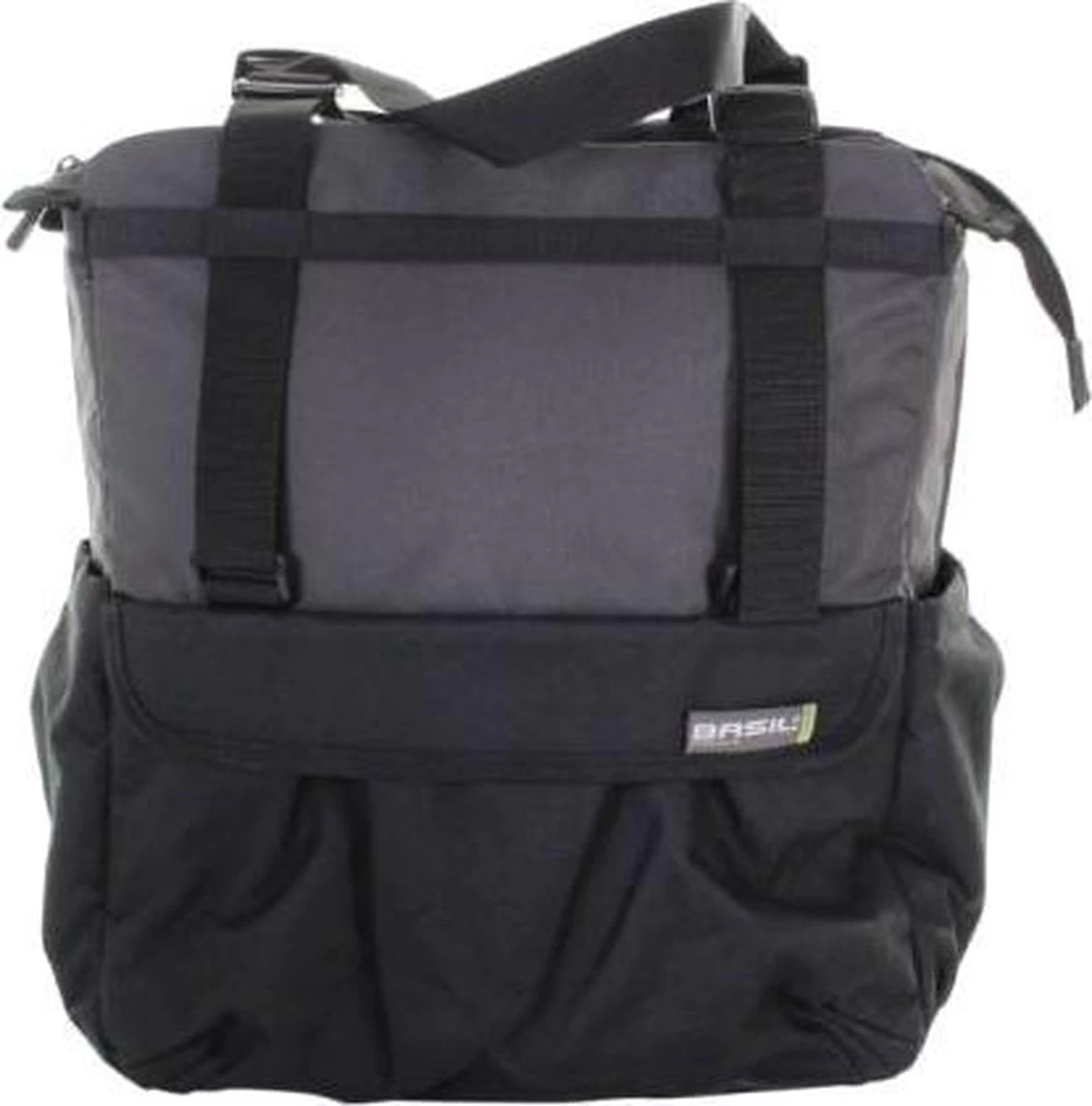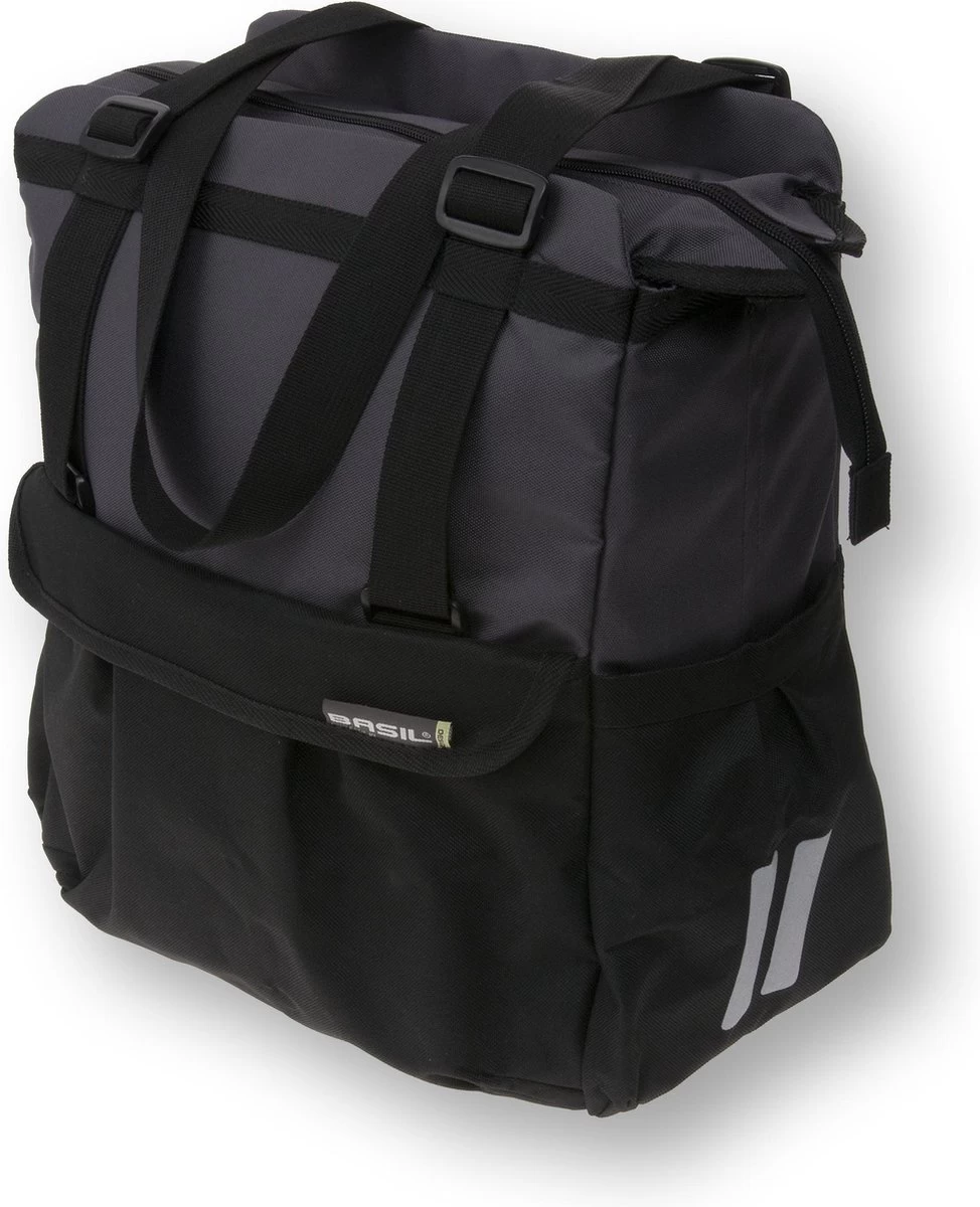 De Basil Shopper XL is een sportieve en trendy fietstas die je aan je bagagedrager bevestigt dankzij het Basil Hook-On System. De tas is verkrijgbaar in de kleur zwart. Deze ruime enkelzijdige boodschappentas is handig als je de supermarkt of markt bezoekt. De tas is voorzien van een groot voor- en binnenvak en daarnaast ookvoorzien van rits- en zijvakken. De totale inhoud van de Basil Shopper XL bedraagt 20 liter. Niet alleen voor een bezoek aan de winkel komt de tas goed van pas. Het is een goede aankoop als je graag naar het strand of een recreatiegebied fietst. Deze shopper is gemaakt van waterafstotend polyester. . De verstelbare draagriemen maken het mogelijk om er schouderriemen van te maken. Beide zijkanten van de fietstas zijn bovendien voorzien van reflectiemateriaal. Daardoor ben je ook in het donker goed zichtbaar voor andere verkeersdeelnemers. In het ritsvak van de Basil Shopper XL vind je fietshaken voor het vastmaken aan je bagagedrager. Haal deze zwart/antraciet fietstas in huis of bekijk de andere modellen fietstassen uit de Basil collectie voor het maken van een weloverwogen keuze. Eigenschappen: Met een inhoud van 20 liter is de tas ideaal voor het doen van grote boodschappen of een bezoek aan het strand. De draagriemen zijn verstelbaar en daardoor te verlengen naar schouderriemen. Reflecties op zijkanten maken je goed zichtbaar in het donker en bevorderen de veiligheid op de weg.