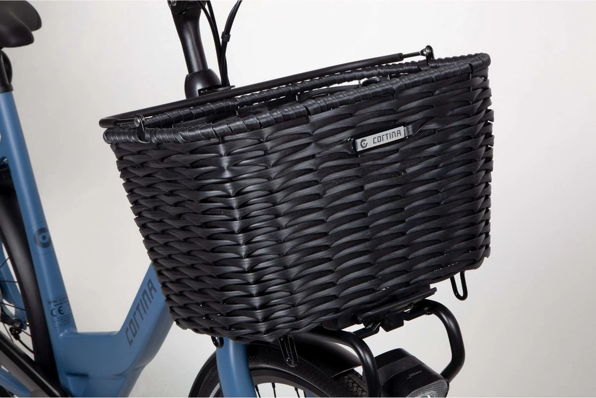 Rechthoekige mand met ronde hoeken gemaakt van wicker en voorzien van kliksysteem geschikt voor AtranVelo System (AVS) en passend op de Cortina Common voor- en achterdrager en de E-Octa achterdrager.