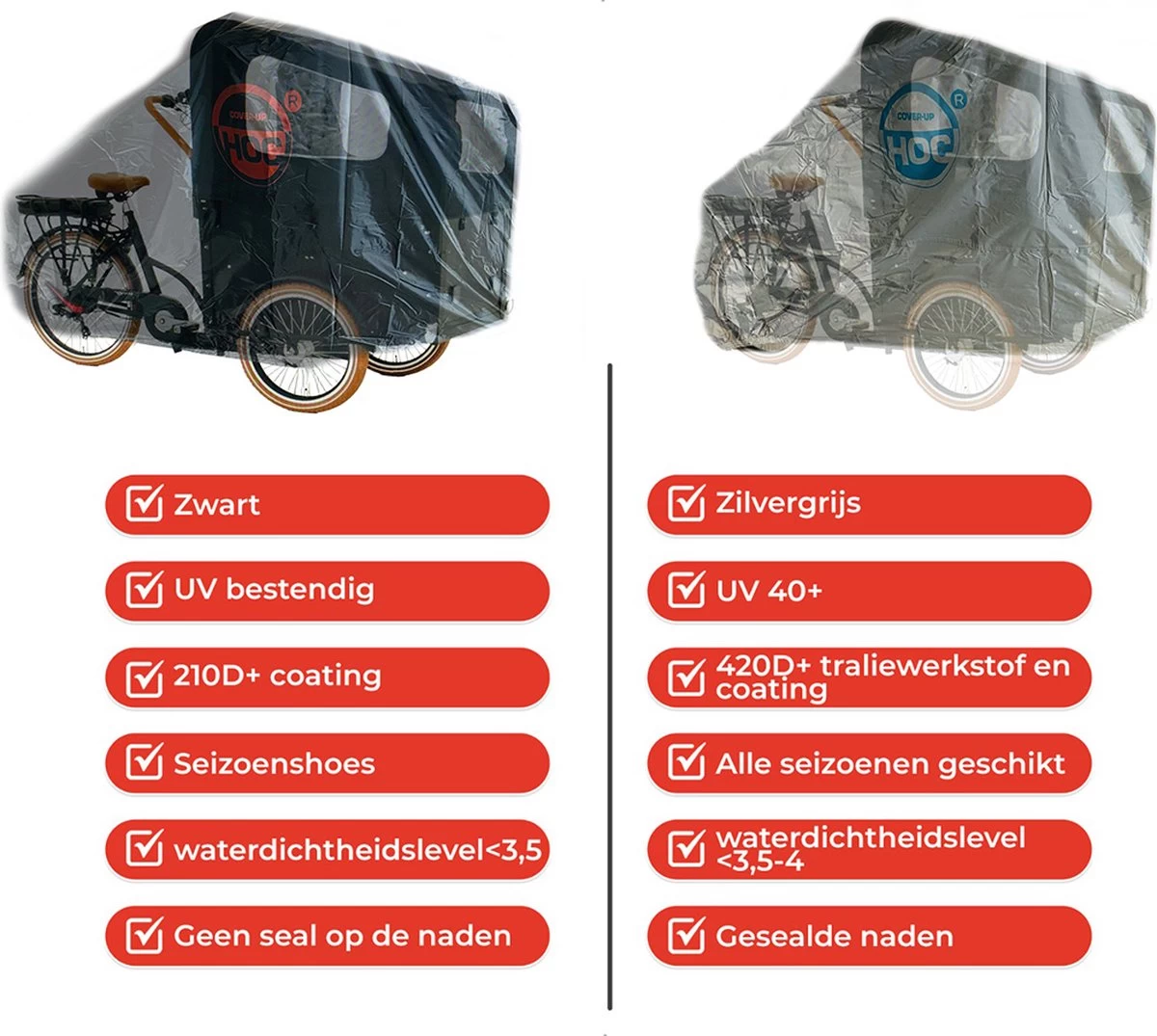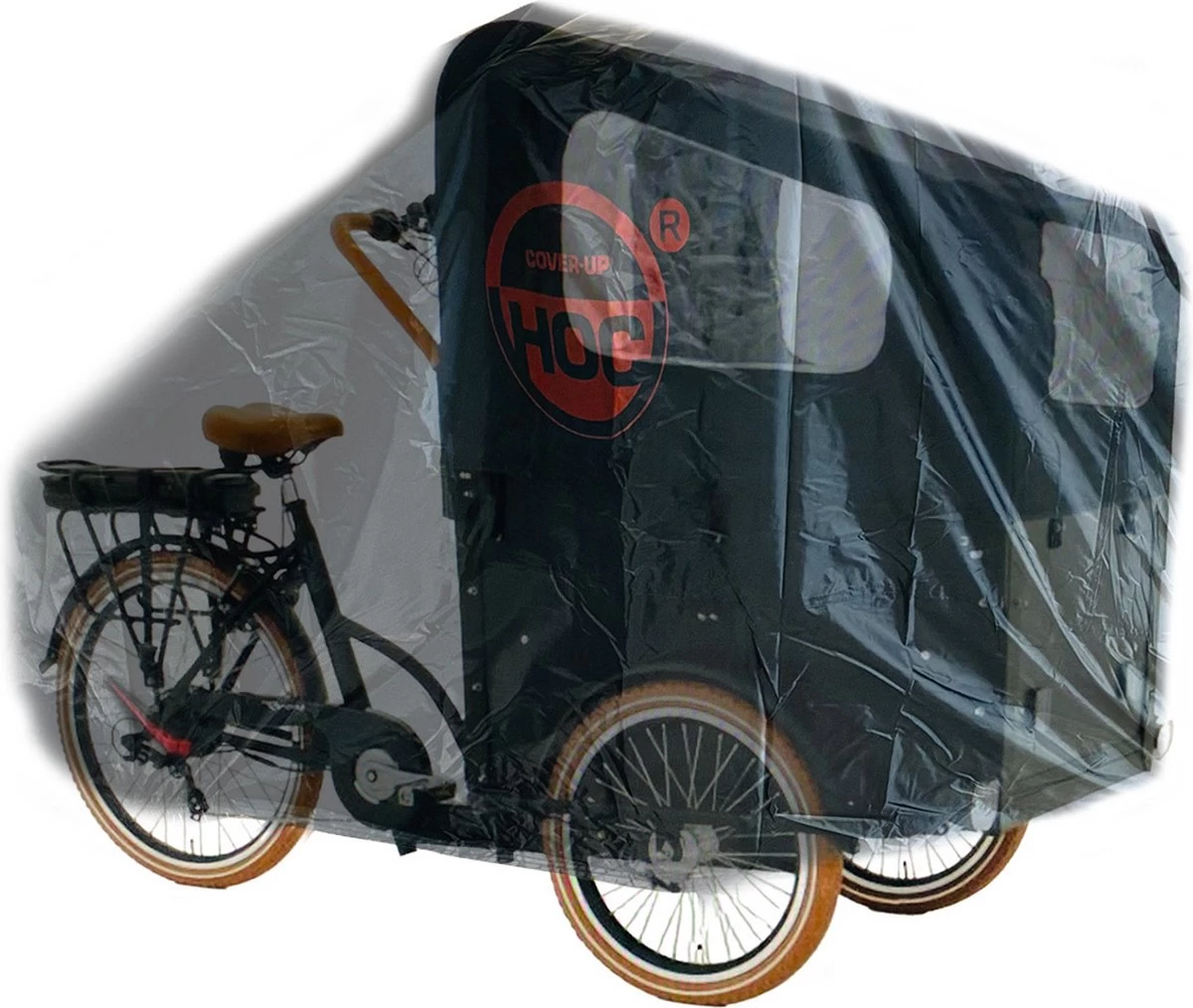 Deze RED label COVER UP HOC bakfiets hoes is een eenvoudige bakfietshoes voor een Troy bakfiets, de hoes is licht van gewicht en beschermt uw bakfiets tegen regen, stof, UV en vorst. Ook beschikt de hoes over een slotgat om uw fiets met een kettingslot te beschermen. Deze hoes is speciaal vervaardigd voor de Troy bakfiets wat inhoudt dat de stormband wat langer is om goed eronderdoor te halen. Daarnaast is het elastische gedeelte van de hoes afgestemd om netjes over het achterwiel te trekken aan om zo het klapperen van de hoes in de wind tot een minimum te beperken en de fiets optimaal te beschermen. De voorkant van de hoes is wat vierkanter gestikt met elastiek erin verwerkt zodat hij goed om de bak heengetrokken kan worden.