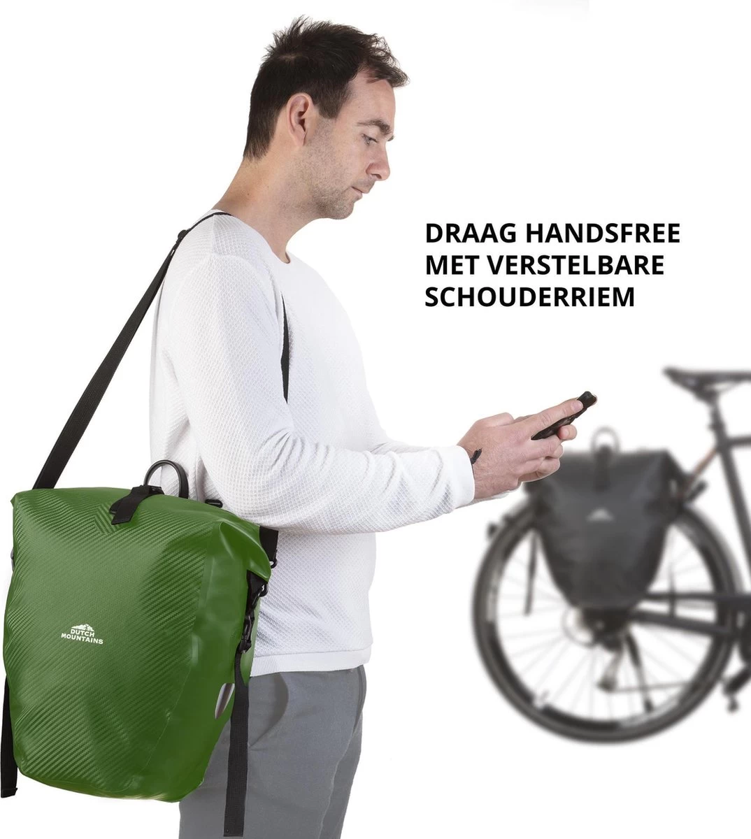 ✓ Sterk. ✓ Sportief design. ✓ Volledig waterdicht. ✓ Supereenvoudig in gebruik. De nieuwe Dutch Mountains Enkele Fietstas combineert maximale duurzaamheid met een lekker sportief design én alledaags gebruiksgemak. Gebruik hem eenvoudig op een reguliere fiets, een elektrische fiets of een sportfiets; ook in de meest uitdagende (weers-)omstandigheden geeft deze beresterke fietstas van hoogwaardig tarpaulin geen krimp. In letterlijk seconden klik je hem met het Quick Lock systeem op je bagagedrager, links of rechts. Nooit meer gedoe met spanbanden of ingewikkelde klemmen!