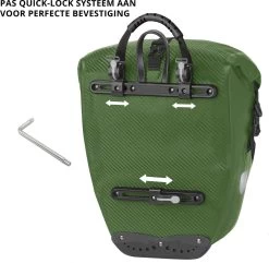 Bovenaan de tas vind je twee verende knijpklemmen, de Quick-Locks. Knijp deze in, hang de tas aan je bagagerek en laat los. De verende klemmen zitten nu vast om het ronde frame van je bagagedrager. Schuif nu de laatste vergrendelingklem onderop de tas achter het frame (wijst zichzelf) en klaar! Bekijk de foto’s om goed te zien hoe simpel het werkt. Je bent in 5 seconden klaar!