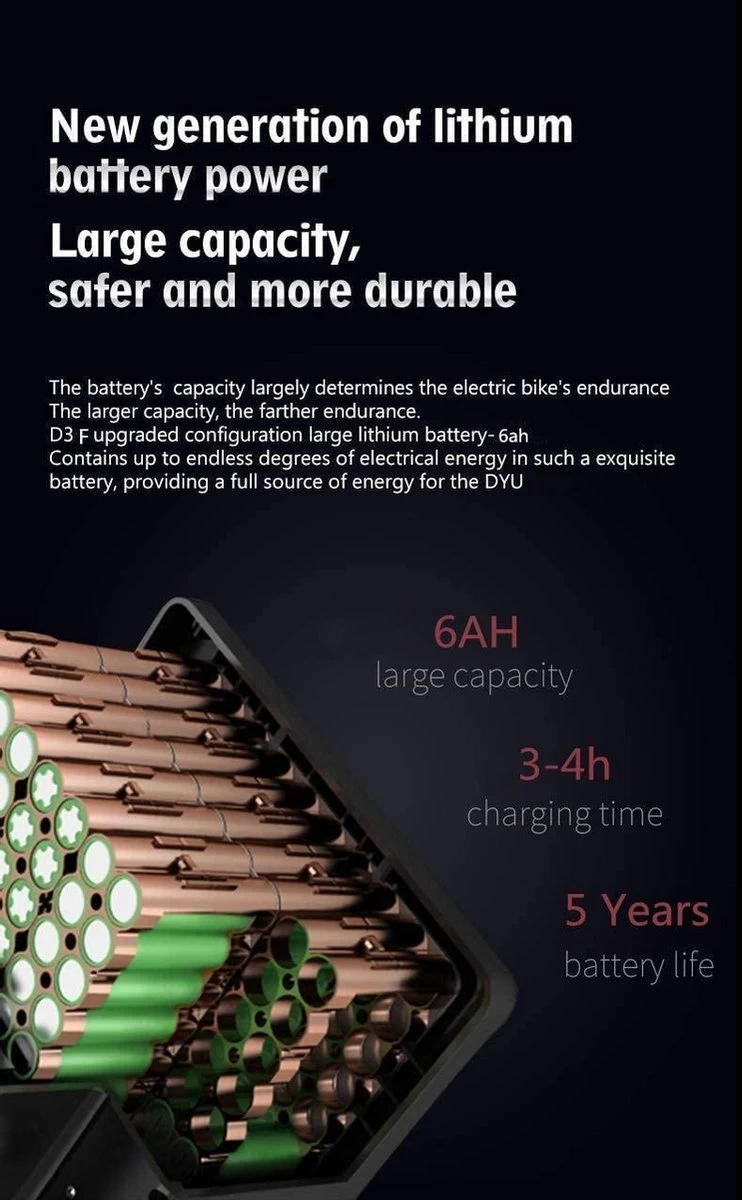 - ☆ 【Batterij met grote capaciteit & hogesnelheidsmotor】 De DYU D3F elektrische fiets heeft een 240W borstelloze full-disk motor, kan stabiele en voldoende rijkracht bieden, en de snelheid kan tot 25 km/u bedragen, 36V 10AH verwijderbare lithiumbatterij met hoge capaciteit duurt slechts 3-4 uur per lading, wat ongeveer 25-45 kilometer rijkilometers kan leveren.