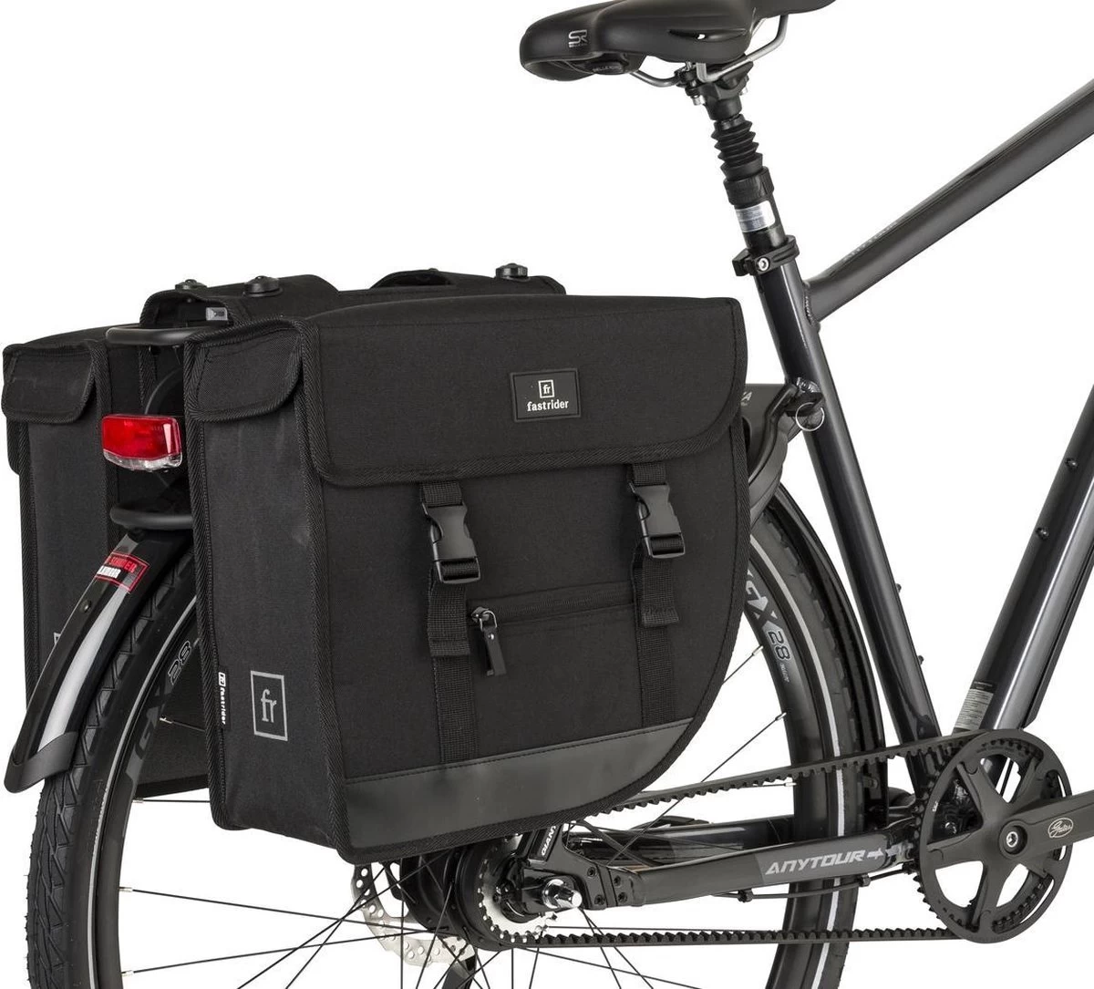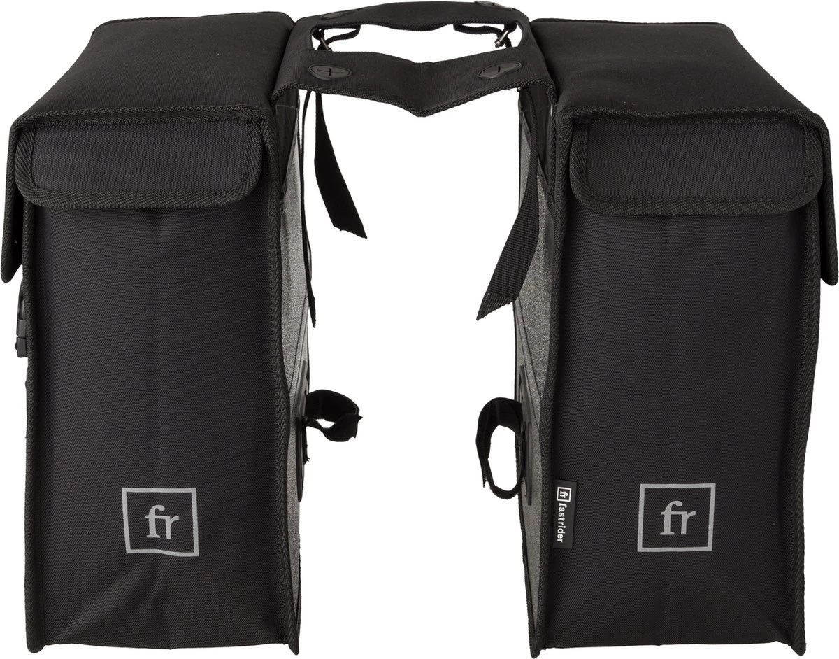 De FastRider Hybride Dubbele Fietstassen zijn speciaal ontwikkeld voor dagelijks gebruik op de fiets. Met zijn inhoud van 26 en 35 liter kan je met gemak al je spullen meenemen. Daarnaast zit deze tas nooit in de weg tijdens het fietsen, de afgeschuinde kanten zorgen ervoor dat hij niet in de weg zit tijdens het trappen. Gemaakt van Gerecycled Polyester is deze tas zeer stevig en hij houdt een kleine regenbui buiten dankzij de waterafstotende coating en de regenoren.