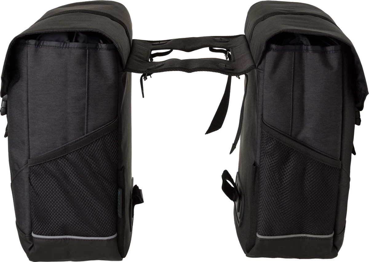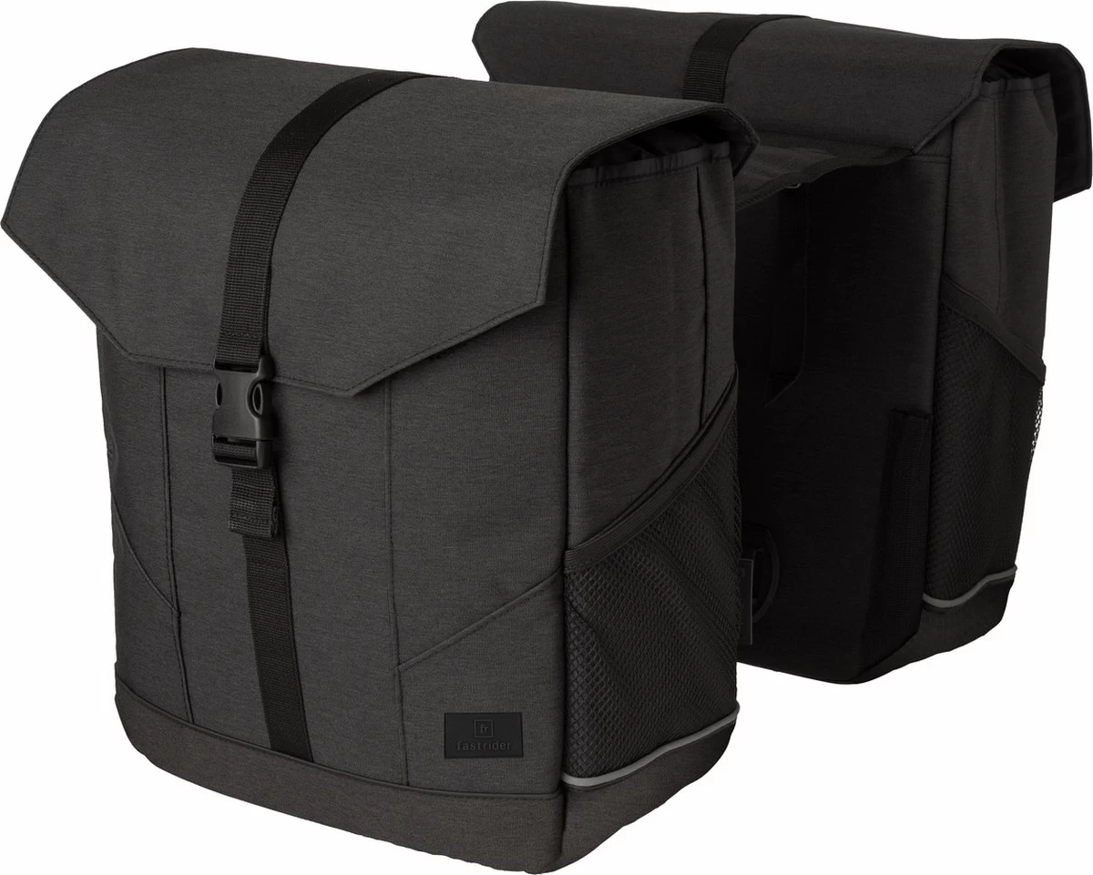 De FastRider Pendler Dubbele Fietstas Grijs (24L) dient een uitstekend doel als zakelijke eye catcher. De tas is gemaakt van waterafstotend Polyester, wat zorgt dat de spullen in de tas droog blijven bij een kleine regenbui. Tijdens een regenbui is zichtbaarheid een belangrijk onderdeel om ongelukken te voorkomen, deze tas heeft daarom reflectie. Deze tas heeft een snelsluiting en klittenband om de klep te sluiten, zo voorkom je dat de inhoud van je fietstas eruit gaat tijdens het fietsen. Aan de bovenkant van de fietstas zitten uitsparingen om snelbinders doorheen te halen. De montage van deze fietstas is gemakkelijk door riempjes en klittenband, maar kan ook worden gebruikt in combinatie met het MIK systeem. Wanneer de tas tegen de wielen aankomen is hij ook uit te breiden met een afstandhouder.