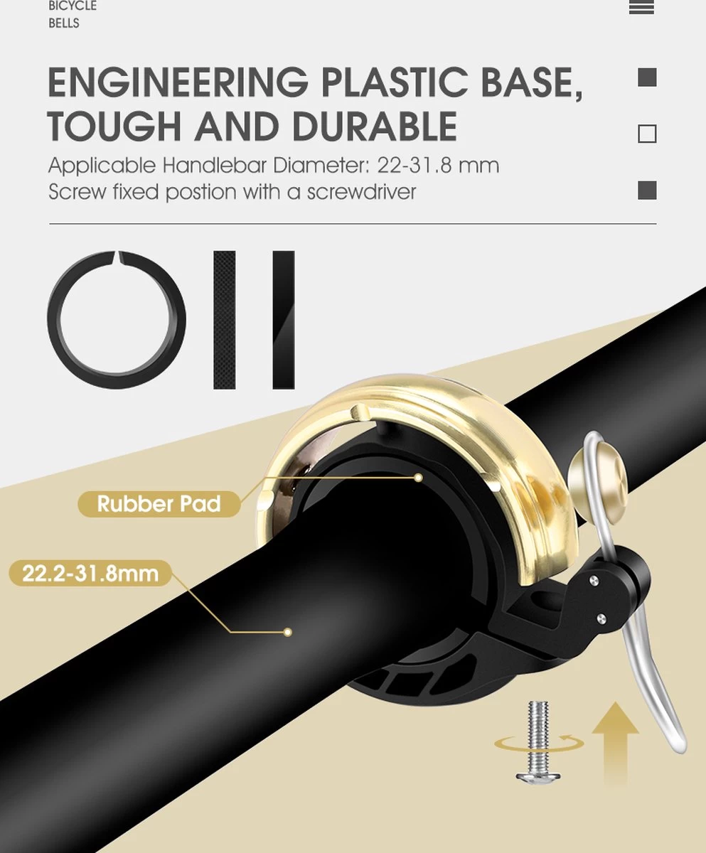 Deze mooie fietsbel is gemaakt van CNC gefreesd aluminium. Hier is een messing klepel op geplaatst om te bellen. De binnenzijde van deze bel is afgewerkt met kunstleer voor een luxe uitstraling én ter voorkoming van beschadigingen op je stuur. Door de eenvoudige montage past deze bel op sturen met een diameter van 23,8 – 31,8 mm.