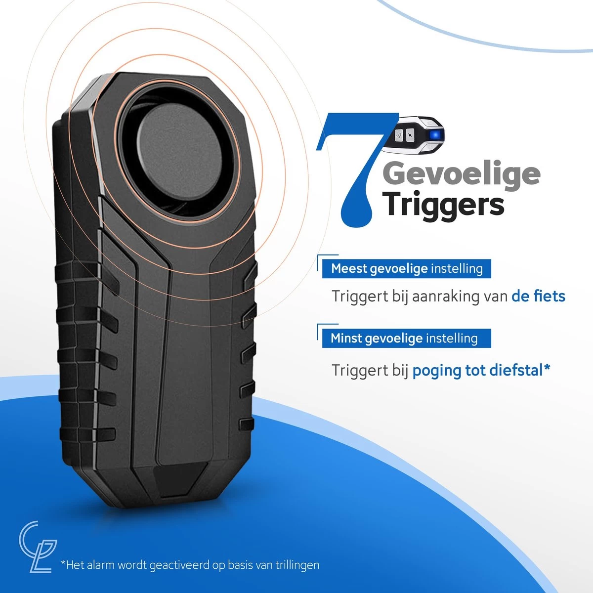 Het alarm gaat af op basis van trillingen die het alarm krijgt. Als iemand jouw fiets aanraakt zal het alarm in beweging komen. Door deze beweging zal het alarm af gaan afhankelijk van de gevoeligheid die is ingesteld.