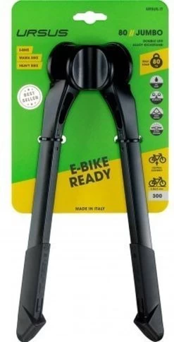 De Ursus Jumbo is een volledig aluminium dubbele standaard. Deze standaard combineert de stabiliteit met mechanische innovatie. De gepatenteerde mechanica zorgt ervoor dat de afstand tussen de twee poten verbreedt tot 40cm waardoor de fiets altijd stabiel gestald kan worden. Productspecificaties: 40cm brede poten wanneer uitgeklapt 20cm brede poten wanneer ingeklapt 300 millimeter lang Belastbaar tot 80 kilogram Gemaakt van sterk aluminium