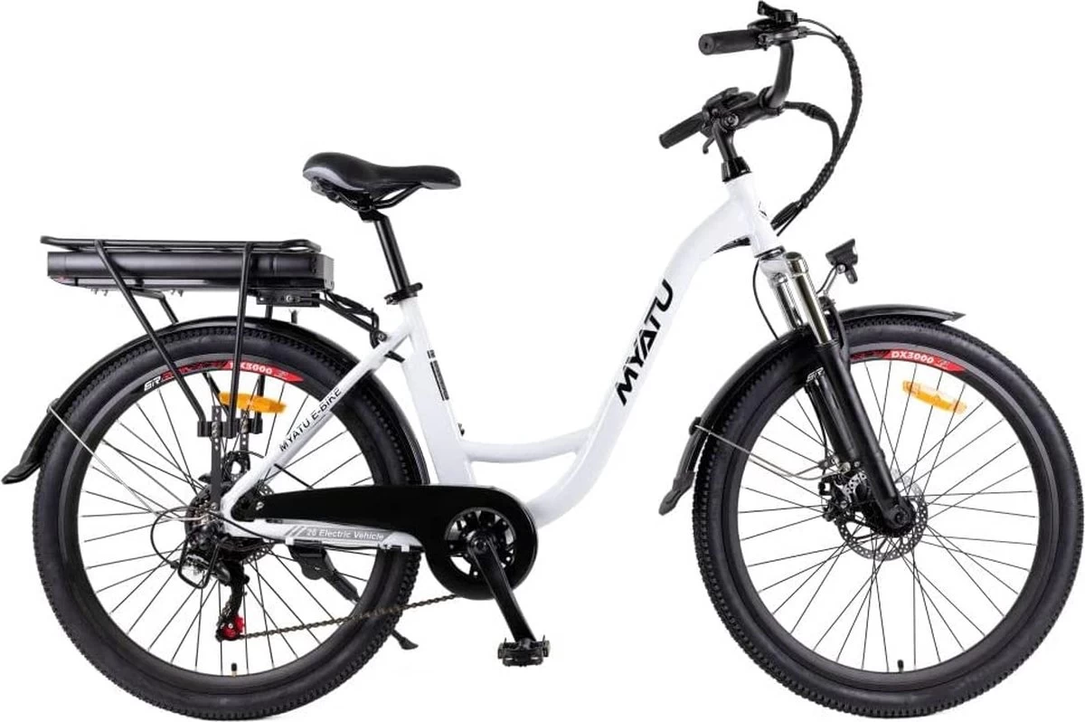 De pedelec stadsfiets (C5685) met elektrische aandrijving van MYATU is geschikt voor iedereen die in het dagelijks leven comfortabele mobiliteit wil in de vorm van een elektrische fiets. Of het nu gaat om het dagelijkse woon-werkverkeer, een ontspannen weekendje weg of een meerdaagse fietstocht. De e-bike in antraciet komt in de comfortabele, voor vrouwen typische vorm met een lage instap, maar is nadrukkelijk voor iedereen geschikt (unisex). State-of-the-art technologie De e-bike met naafmotor haalt een snelheid van 25 km/u. Het hoogtepunt is de ingebouwde zitbuisbatterij, die niet alleen visueel minder opvalt door de slimme positionering, maar ook het rijgedrag verbetert door een laag zwaartepunt. De Li-Ion-accu is duurzaam en snel weer opgeladen nadat hij afhankelijk van de intensiteit tot 65 km ondersteuning kan bieden. Het bereik van een pedelec is b.v. grotendeels afhankelijk van de volgende factoren: – geselecteerd ondersteuningsniveau – belasting van de fiets (gewicht van de berijder plus bagage) – terreinprofiel (niveaus/bergop/bergafwaarts) – geselecteerde versnelling – ondergrond (asfalt, onverharde weg, onverharde weg, bosbodem , modderige ondergrond) – Type e-bike en banden – bandenspanning – laadniveau van de batterij – buitentemperatuur – windomstandigheden – cadans De e-bike hoeft niet geregistreerd te worden en is volledig uitgerust volgens StVZO. Voor een snelle start wordt de fiets voor 85% voorgemonteerd geleverd. De levering vindt plaats door een expeditiebedrijf. Geniet van een volledig uitgeruste, gebruiksvriendelijke, op comfort gerichte hybride e-bike met een duurzame en krachtige batterij.