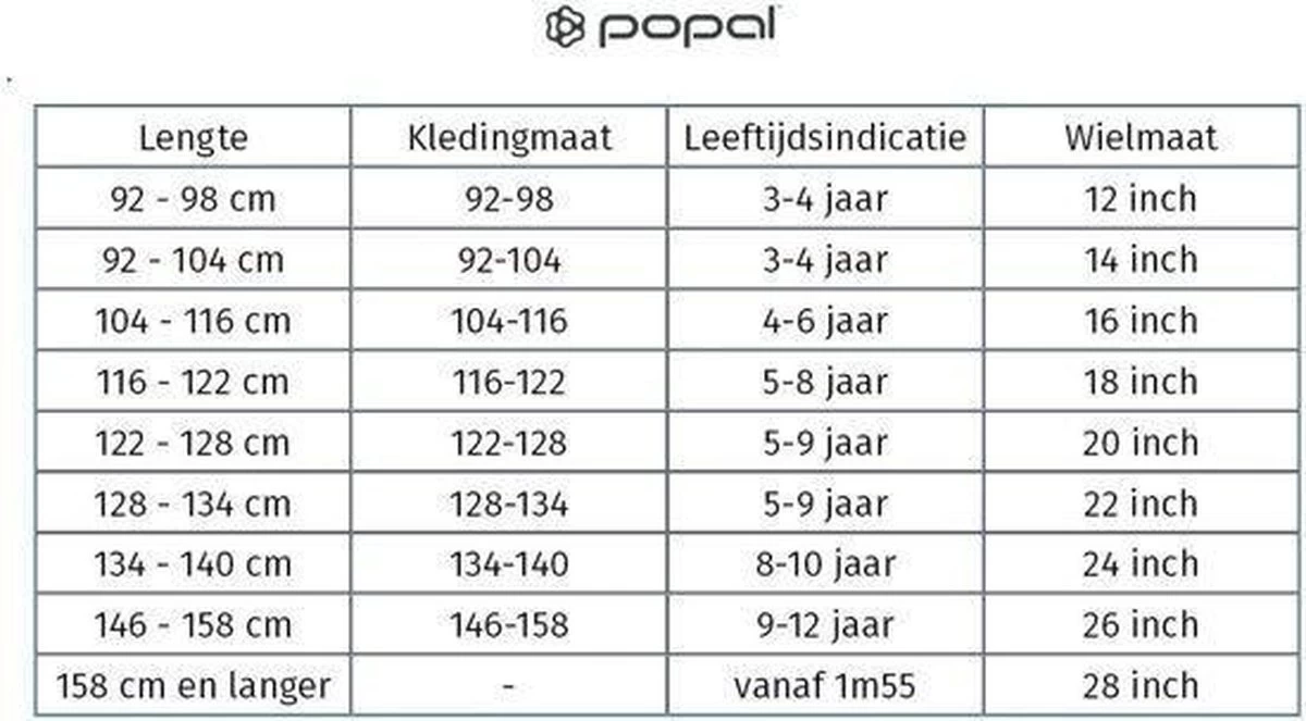 wielmaat in inchLeeftijdsindicatieKledingmaat12 inch2 – 4 jaar92 – 9814 inch4 – 5 jaar92 – 9816 inch4 – 6 jaar104 – 11618 inch5 – 8 jaar122 – 12820 inch5 – 8 jaar122 – 128 22 inch5 – 9 jaar128 – 13424 inch8 – 10 jaar134 – 14026 inch9 – 12 jaar146 – 158